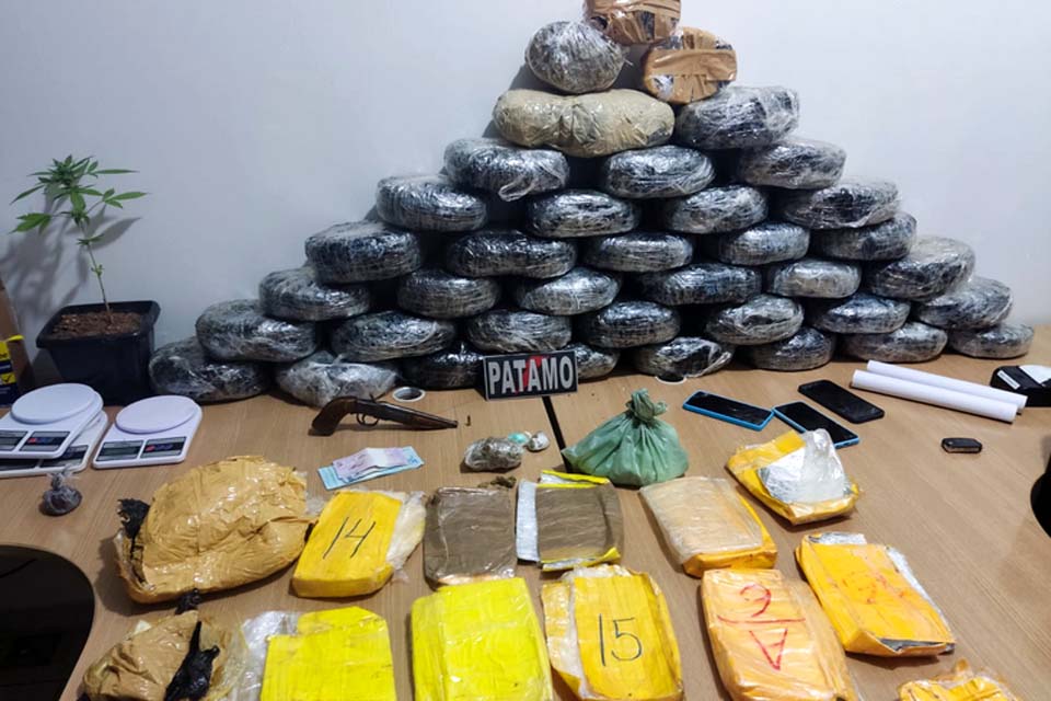 Na ação, os policiais apreenderam aproximadamente 37 quilos de maconha, cerca de 840 gramas de cocaína, uma arma de fogo