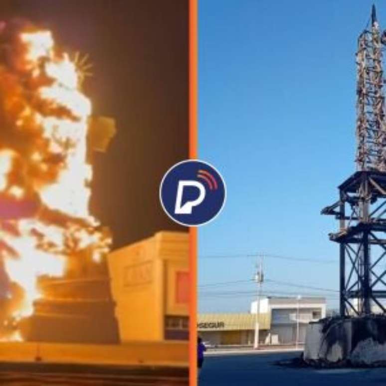 Estátua da Havan durante e depois de incêndio, em Pernambuco.Foto: Fotos: Reprodução. Arte: Portal de Prefeitura / Portal de Prefeitura