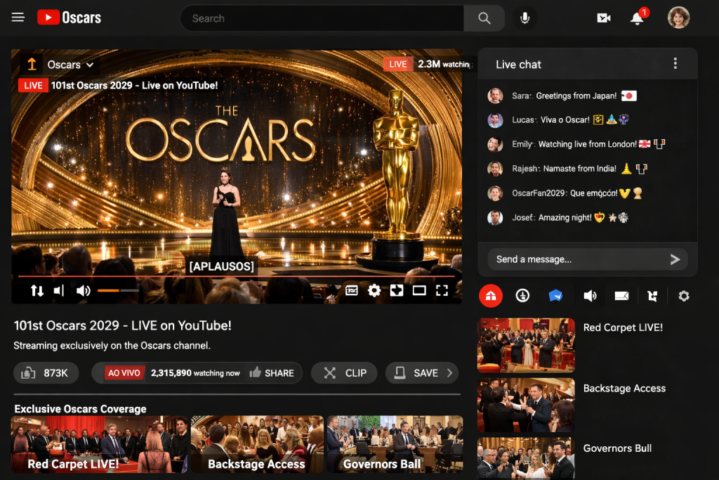 A Academia de Artes e Ciências Cinematográficas dos Estados Unidos, responsável pela cerimônia do Oscar, anunciou um acordo histórico com o YouTube. A partir de 2029, com a 101ª cerimônia, a plataforma de streaming do Google passa a deter os direitos globais exclusivos de transmissão da cerimônia, em um contrato de longo prazo que vai até 2033. Na prática, isso significa que o maior prêmio do cinema mundial poderá ser assistido ao vivo e gratuitamente por mais de 2 bilhões de usuários da plataforma em todo o planeta. Nos Estados Unidos, a transmissão também estará disponível para assinantes do YouTube TV.